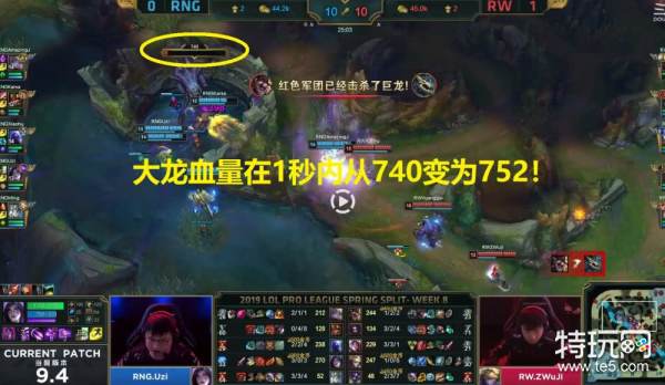 那么RNG这条大龙是如何被抢的呢?笔者仔细回放了录像后发现,RNG被抢龙或许是因为男爵升级回血了!刚到25分03秒的时候,大龙还剩740滴血,而此时karsa的惩戒还没有用,EZ大招正好飞到karsa身上。超出25分03秒的时候,EZ的大招飞过karsa身上伤害触发,皇子的血量下降一点,而此时大龙的血量是752。也就是说,在不到一秒的时间内,大龙回了12点滴血。在LOL这个游戏中,有什么原因可以使正在被打的大龙回血吗?