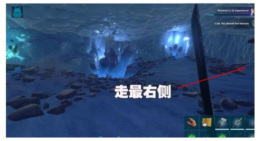 一、进入洞穴,到分叉口位置,直接选择最右侧洞口。其他最好不走,容易迷路掉坑里。
