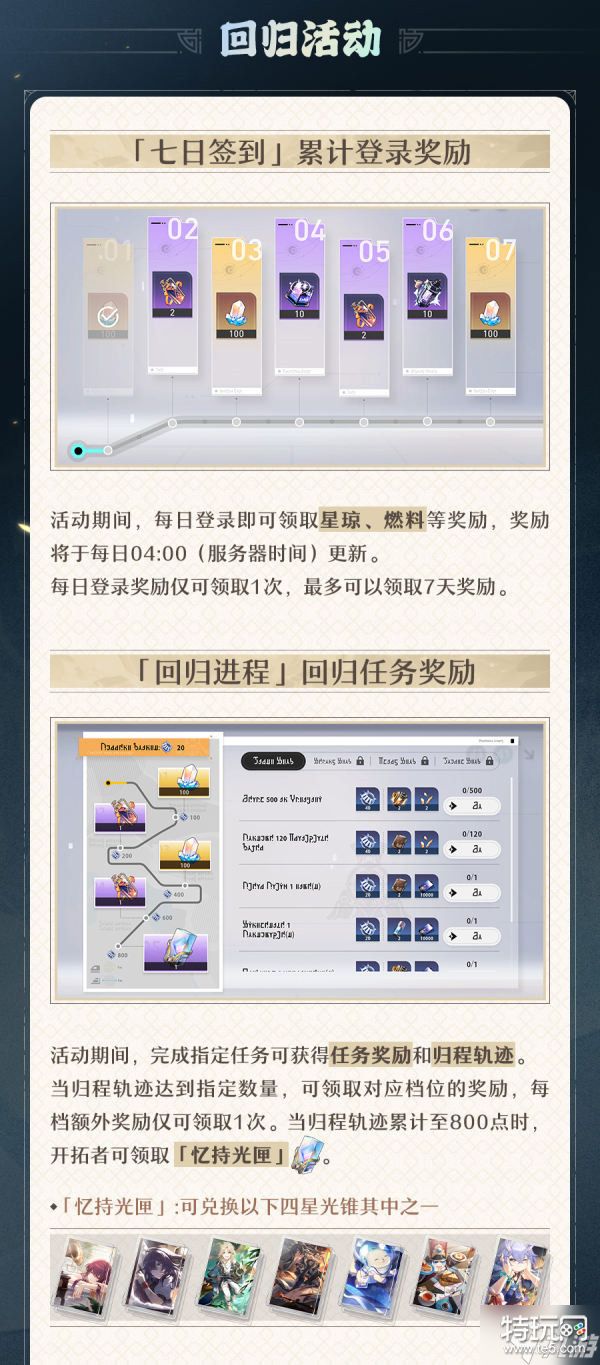 2、活动期间,完成指定任务可获得任务奖励和归程轨迹。当归程轨迹达到指定数量,可领取对应档位的奖励,每档额外奖励仅可领取1次。当归程轨迹累计至800点时,开拓者可领取“忆持光匣”。忆持光匣可在四星光锥池中选择兑换任意一个。星琼奖励总共合计500左右。