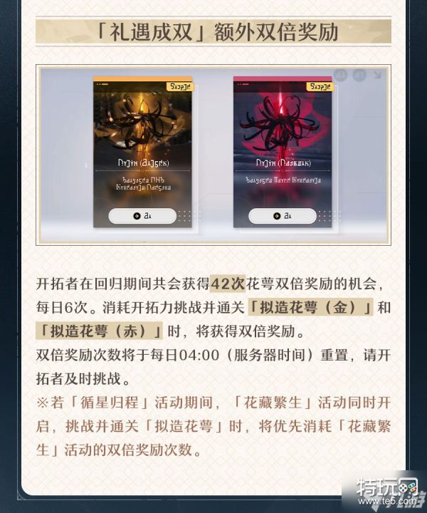 3、开拓者在回归期间共会获得42次花萼双倍奖励的机会,每日6次。消耗开拓力挑战并通关「拟造花萼(金)」和「拟造花萼(赤)」时,将获得双倍奖励。