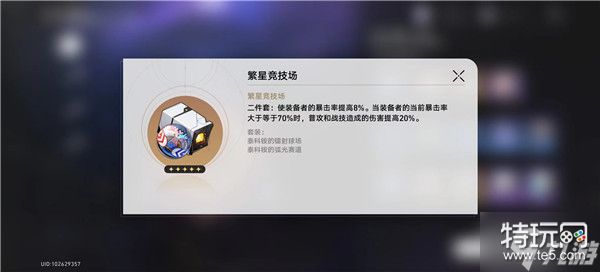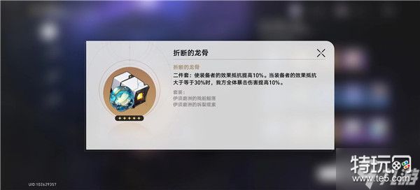 二件套效果:使装备者的效果抵抗提高,当装备者的效果抵抗大于等于30%时,我方全体暴击伤害提高10%,还是很好触发的。