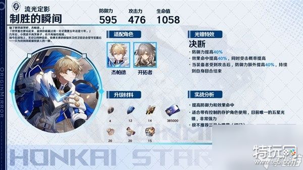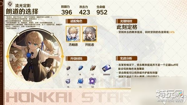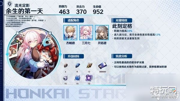 高额的防御加成使得存护类角色可以为队友提供更高额的护盾,同时效果命中的提升使三月七、杰帕德的冻结和火主的嘲讽更加稳定,是一个通用性很强的光锥。