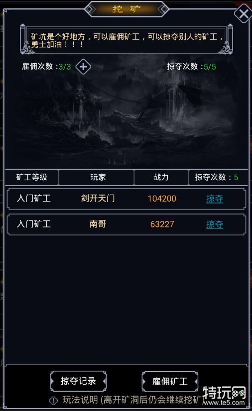 玩家通过雇佣矿工,30分钟后获得固定数量的小金条和黑铁矿石。可以通过消耗元宝提升矿工的等级,增加获得的小金条以及黑铁矿石的数量。消耗200元宝提升一次等级,有几率成功,同时增加一点幸运值。当幸运值满时,提升等级一定成功。还可以花费1540元宝直接提升矿工至满级,并且不会被掠夺。玩家一天挖矿三次,可以通过消耗200元宝增加一次挖矿次数。
