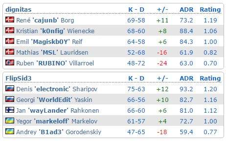 丹麦人在自己选择的overpass上开局不利0-5落后,不甘心失败的丹麦人随后发起了强有力的进攻,取得了上半场余下10分中的8分。下半场dignitas打出5-0开局,虽然F3奋力追赶了一些分数,但dignitas还是利用了CT方的优势将双方拉到同一起跑线。