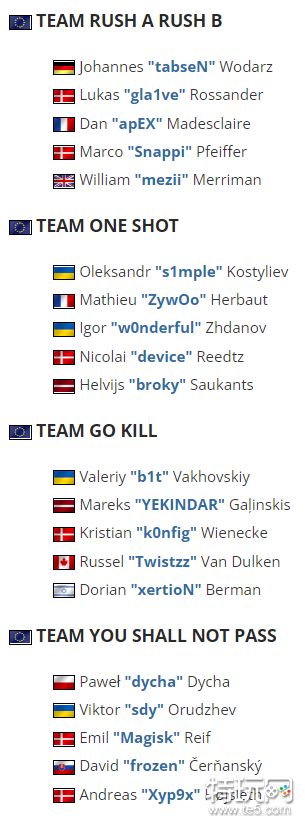 TEAM YOU SHALL NOT PASS则由五名辅助位选手组成,其中包括前A队选手Magisk及现A队选手Xyp9x这组传奇组合。而最后的TEAM GO KILL则由各支队伍的明星位选手组成,其中包括Twistzz、YEKINDAR及b1t等选手。