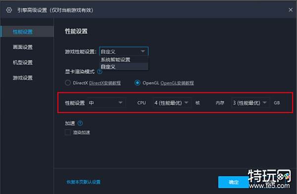 进入游戏后,点击引擎右上角设置—引擎设置—性能设置,先将游戏性能设置调整为”自定义“,再调整至需要的数值,通常”中“为系统根据电脑情况给的最优值,具体可根据游戏要求进行调整,若游戏推荐的性能设置超过电脑性能的三分之二,若想达到完美的游戏效果,建议升级电脑配置。