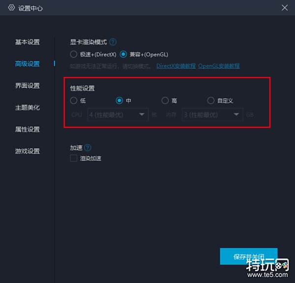 点击模拟器右上角设置—设置中心—高级设置,即可调整性能设置,通常”中“为系统根据电脑情况给的最优值,具体可根据游戏要求进行调整,若游戏推荐的性能设置超过电脑性能的三分之二,若想达到完美的游戏效果,建议升级电脑配置。