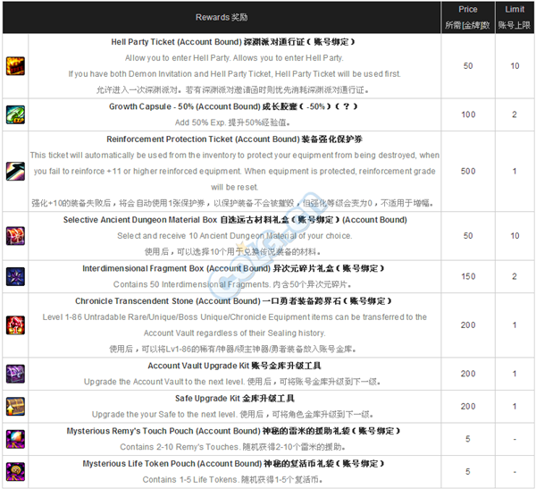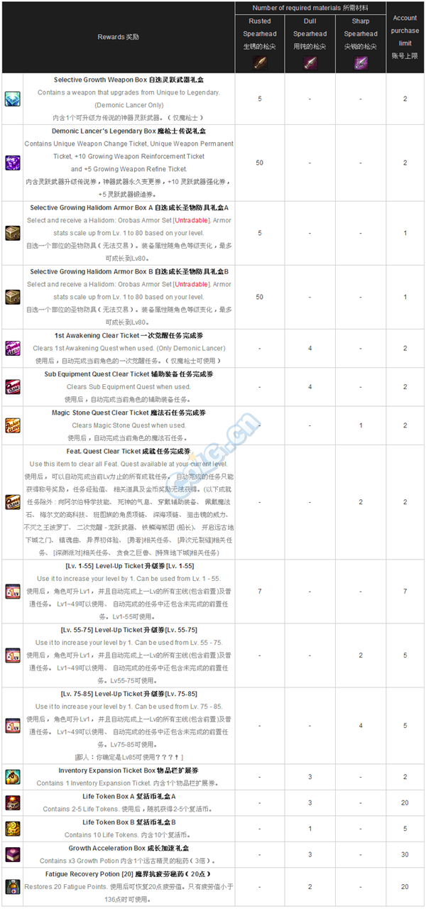 3. 一次觉醒任务完成券,自选灵跃武器礼盒,自选圣物防具礼盒(A, B)均为只有魔枪士可使用。