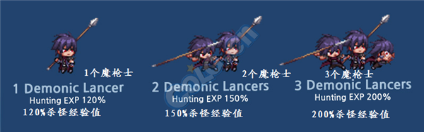 2. 魔枪士组队杀怪经验值增加:1个魔枪士120%杀怪经验值,2个魔枪士150%杀怪经验值,3个魔枪士200%杀怪经验值。