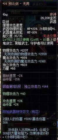 9:别云剑—卵用:争议大!副作用大!!但是!!对于高命中高暴击(80以上)的来说就是高爆发!别跟我提冲突!别的黄字都得让位。。爆发还是排在荒古后面吧,毕竟。。。综合实力排在名刀后面。