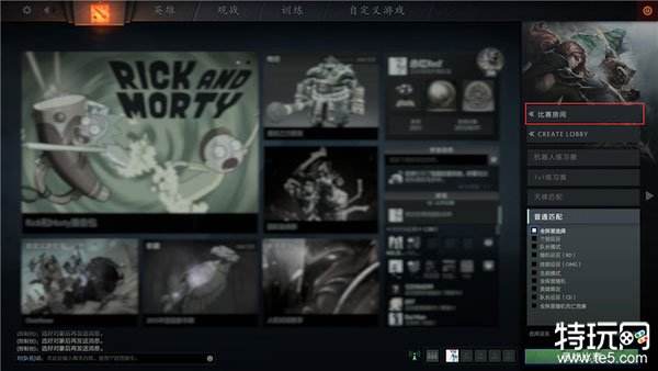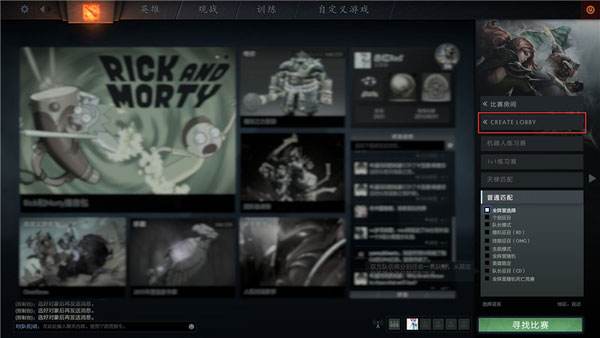 点击右下角的开始DOTA会出现右侧导航栏,选择“CREATE LOBBY”(创建房间)即可建立一个比赛房间。