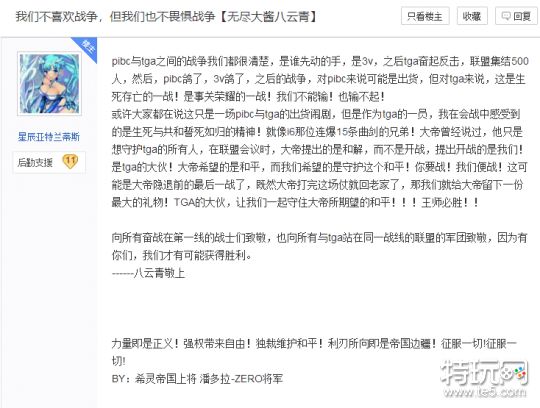 面对劲敌的强势入侵,八云青曾在贴吧论坛等地洋洋洒洒地写了一封宣战书,代表TGA联盟的主战派,向PIBC一方将领传递了一封名为“我们不喜欢战争,但我们也不畏惧战争”的战书。