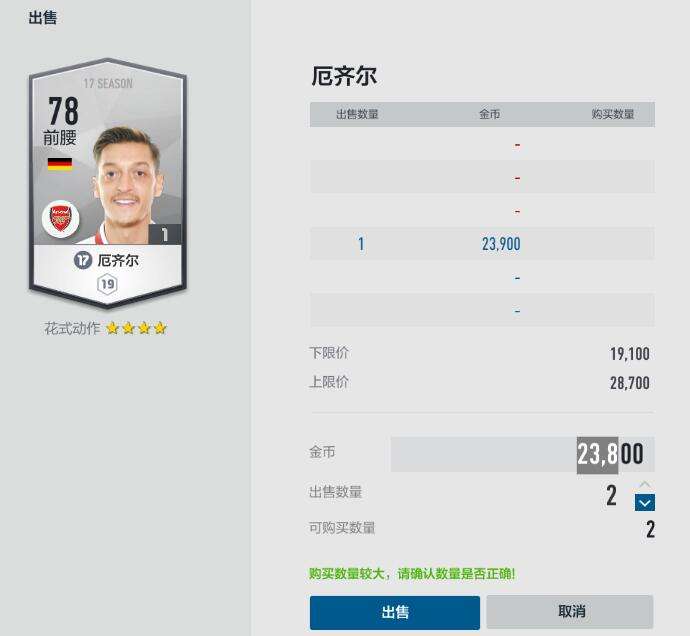 球员出售功能只对预备队里面的球员生效,在一线队中的球员将不允许出售,鼠标停留在预备队球员信息区域,出现出售按钮,单击可呼出出售信息确认界面,在该界面中玩家可批量出售同一名球员,可调整出售价格。