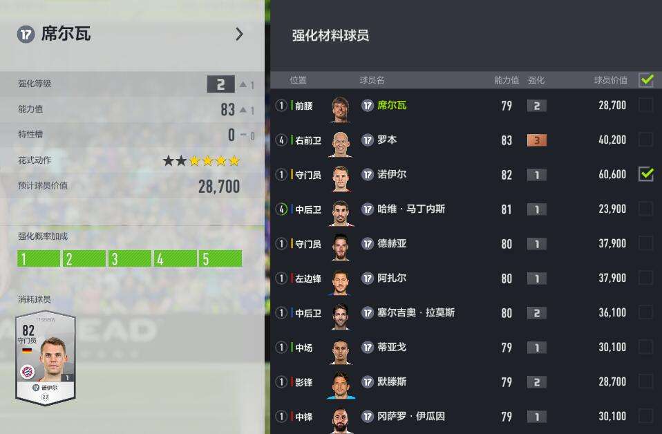 左侧为当前选择球员的基础信息,点击上方名字可改变强化球员,右侧为强化材料球员,每次强化可选择1-5名球员作为强化材料,强化材料与被强化球员无需为同一名球员,若强化材料与被强化球员为一致时,有概率触发特殊强化并且在强化失败时有概率恢复球员强化等级。选择的材料越多强化概率加成越高。