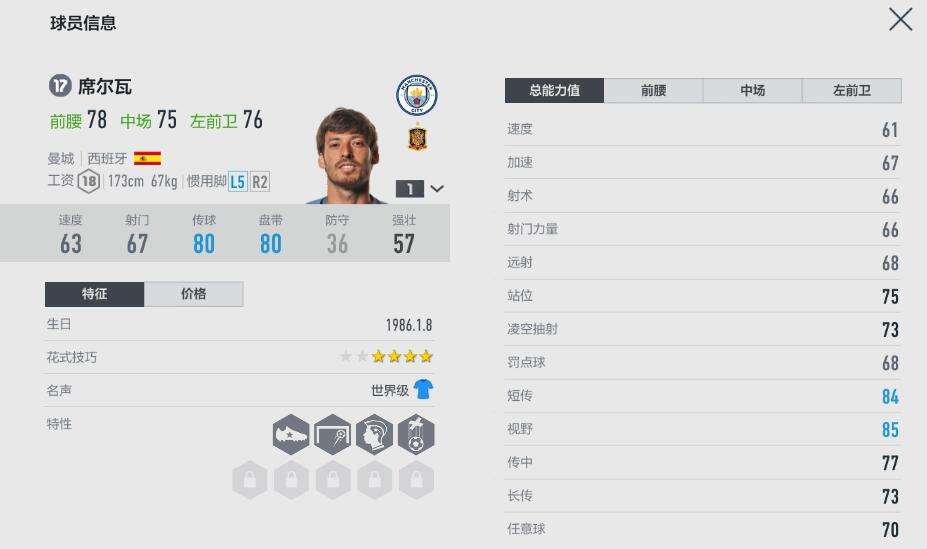 当鼠标停留在球员信息区域,界面上将出现查看按钮,点击呼出弹层可查看球员详细信息。在弹层中玩家可选择不同的强化等级以及球员擅长的位置的关键数值信息。