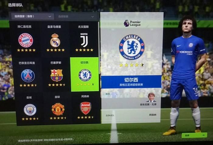 输入教练名称后进入球队选择界面,我们可以看到系统为我们推荐了九支球队,分别是拜仁慕尼黑,皇家马德里,尤文图斯,巴黎圣日耳曼,巴塞罗那,切尔西,曼城,曼联和阿森纳。除了第一排的拜仁,皇马,尤文为满星(五星)球队以外,其余均为四星半球队。看来在FIFA OL4中,这三支球队应该在起步时稍强于其他球队。由于选择球队后将获得该俱乐部整支球队的球员(但均为无法强化的加0球员),而非像FIFA OL3内测时只能获得能力值较低的随机球员,因此选择初始球队时尽量选择五星球队。