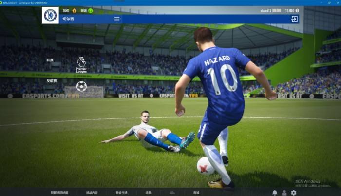 主界面比起FIFA OL3来说,画面精美了不少,但是无法选择并操作首发球员进行射门练习,转而改为了首发阵容中的球员自动进行攻防演练的动画,如上图,AZP倒地铲断带球的阿扎尔。