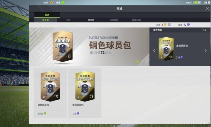 目前商城只有两种卡包出售,当前赛季铜色和金色球员卡包,分别可以开出72能力值和78能力值以上的球员。其中,铜色球员包可以使用踢比赛获得的金币购买,金色球员包则需要使用完成每日任务获得的球票购买。另外,每升一级可以获得一个当前赛季银色球员卡包,可开出75能力值以上的球员。