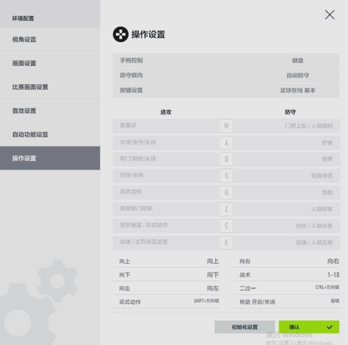 接下来让我们看一看游戏设置界面。在操作设置界面,依然可以选择使用键盘或手柄操纵比赛。新增了防守倾向选择栏,玩家可以选择自动防守或策略防守,按键设置也可以选择FIFA OL系列传统键位或根据自己的喜好自定义键位。