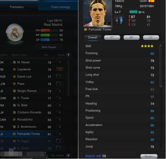 总评:射门9 盘带7 速度8 身体性 6 灵巧性 8 适合中高水平的大神,另外打防守反击也是新手的首选!