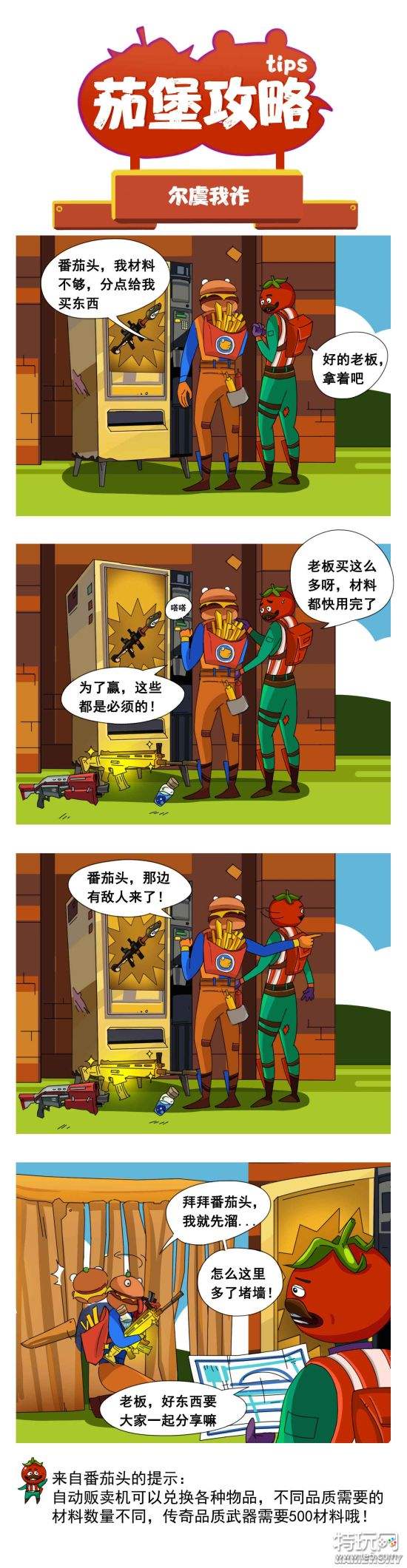 来自番茄头的提示:自动贩卖机可以兑换各种物品,不同品质需要的材料数量不同,传奇品质武器需要500材料哦!