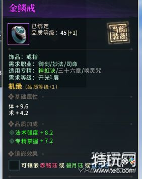 比如这个戒子45品,在属性上加专精和法术强度,50品戒子是加急速属性,所以推荐大家用45品的、只需要在首饰上打急速宝石即可