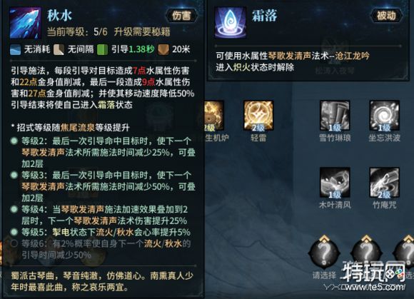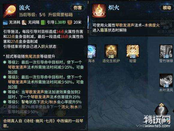 这两个技能是妙法的主要资源生成技能(最高叠加2层的琴歌加速效果),同时会在技能结束时进入对应的属性触发不同的琴歌发清声变招,流火的伤害远高于秋水(火属性状态伤害均高于冰属性,冰属性主要用于回蓝,以下不在做过多的介绍)