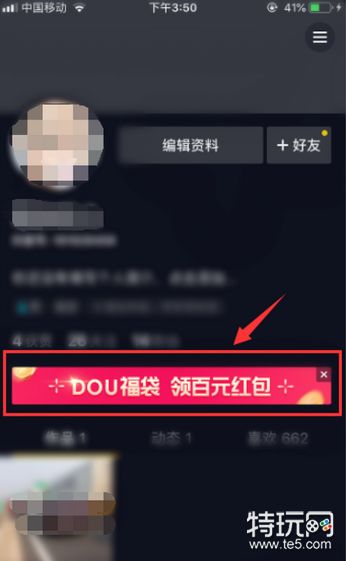 在个人页面,点击图示处的“dou福袋 领百元红包”。