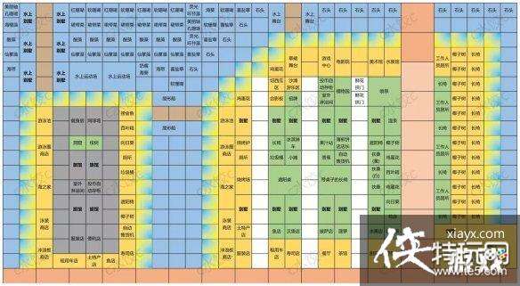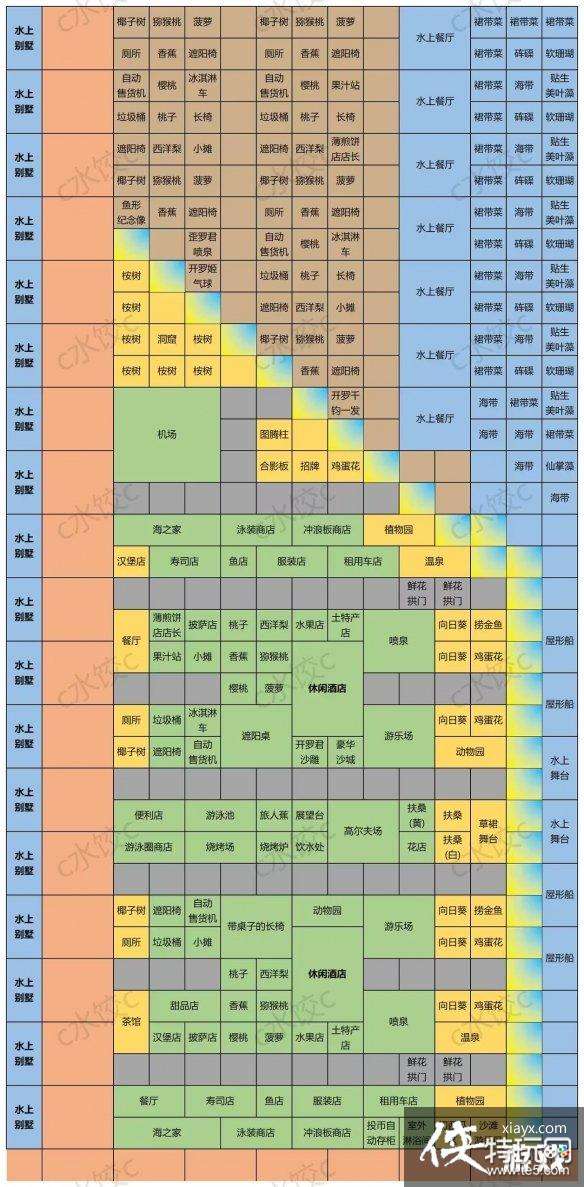 该布局包含所有景点和旅行计划(除死路构成的减魅力灵异景点),海洋植物布局仅作参考,可自由发挥。