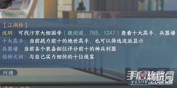 和魏闻道对话可以查看十大高手、兵器谱、伯仲之间。