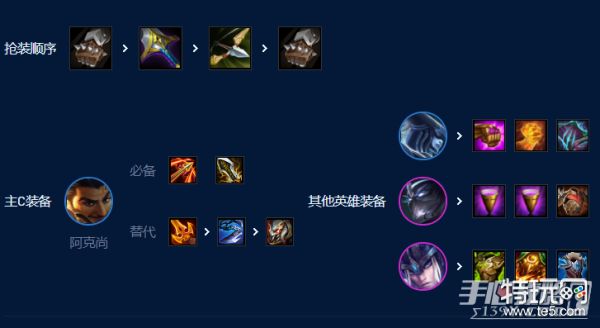 主C阿克尚卢安娜的飓风必备,第二件优选无尽之刃,第三件锐利之剑=巨人捕手>泰坦的坚决=第二件卢安娜的飓风副C丽桑卓珠光护手、正义之手、莫雷洛秘典辅助慎1-2能量圣杯再补件防装所有由腰带合成的肉装给瑟庄妮,有守护者之誓也给瑟庄妮上一个。
