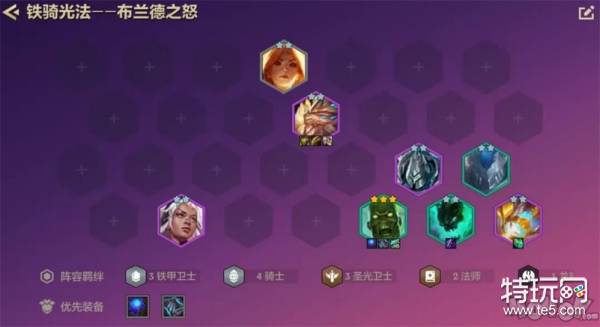 阵容坦度方面也是比较高4骑士全员减伤40点;3铁甲增加全员70护甲,3圣光棋子均能增加20双抗,能给布兰德创造非常优质的输出环境。