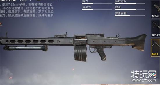 MG3也是一支空投枪,作为轻机枪他的伤害很高并且弹量巨大,具有很强的火力遏制能力,缺点是弹夹转换较慢,堪称是轻机枪中的威力最大武器。