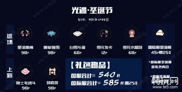 3、国服的礼包,主要有圣诞鹿角98元、暖冬瑞雪斗篷98元、白绒斗篷68元、雪花发卡12元、水晶球68元、白雪斗(隐士毛绒斗)98元、球套装(球门和球)98元。新旧一共七个礼包,价值540元。