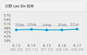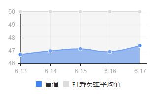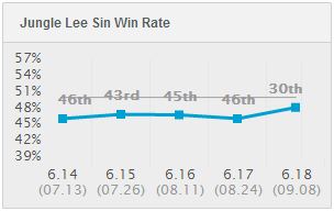 登场率提高了,那么胜率呢?瞎子在美服的胜率,由6.17版本的46.09%增加到了6.18版本的48.16%,增加了2.07%!胜率排名从第46位上升到了第30位!而且这个数据只是截止至9月9日,作者相信随着时间的推移,登场率,禁用率以及胜率,都会有大幅的提升!
