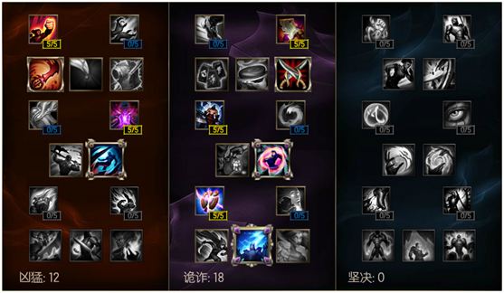 诡诈系:点满野蛮毋庸置疑,对于打野英雄来说,这点天赋在前期就等于5点攻击力,更别说是瞎子这种被动可以增加攻速的英雄了;点出刺客增加蹲人/gank时的输出,也有的玩家喜欢点出符能亲和增加buff的持续时间,这一点主要根据个人喜欢,影响不大;作为输出型打野毫无疑问的点满无情增加输出;点出危险游戏增加反杀的机会,而且打野英雄点探云手作用太小了,几乎可以忽略不计;点满精密增加输出,更容易gank;最后点出雷霆领主的法令增加gank时的爆发。