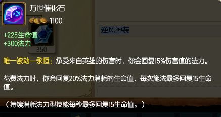 乍一眼看去,被动技能似乎有那么一点变态,难怪会被删除,不过今天的主题还是万世催化石,这件装备的价值是1100g,除了增加血和蓝之外,拥有一个特别的被动:当受到英雄伤害时可以把受到的伤害百分比转化为法力,使用法力又能回复生命,非常强的一件装备。
