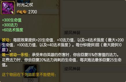 每一分钟可以获得20生命值,10法力值,4法强,一共可以获得10层被动,一共是200生命,100法力,40法强,相当于又多了大半个时光之杖。从时光购买到叠完被动需要10分钟的时间,才可以获得最大化的属性,而最终时光的属性为500生命,400法力,100法强。远比海克斯科技GLP-800多了200生命和20法强,相当于1268G的经济价值。