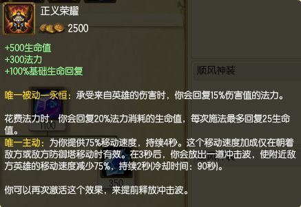 这件装备,曾经一度被上单喜爱,但是随着削弱,逐渐失去了它的身影。正义荣耀继承了万世催化石的属性,在此基础上,多了一个主动技能。这个主动技能是一个开团的神技:单位时间内朝着敌方或敌方防御塔移动时可以提升75%的移速,并且可以施放冲击波减速。诸如泰坦,奥拉夫,大树等等,都非常的合适。