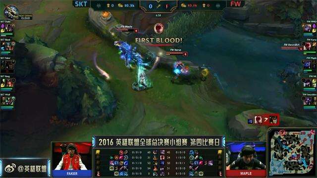 SKT拿出了奥拉夫后,在前期的决策是快速刷野到六,并没有进行太多的GANK。这让FW找到了一波机会,七分钟的时候盲僧配合龙王成功击杀了蛇女。