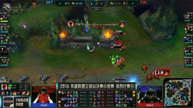 比较尴尬的是,FW到了比赛中期似乎再次失去了节奏,并且他们有些太过于执着抓Faker在,多次击杀Faker失败后,SKT其他路的发育几乎远远超过FW。事实上,此时的FW在团战中还是很难打过SKT的。FW必须要在盲僧还比较强势的这段时间内做出一些什么事情。