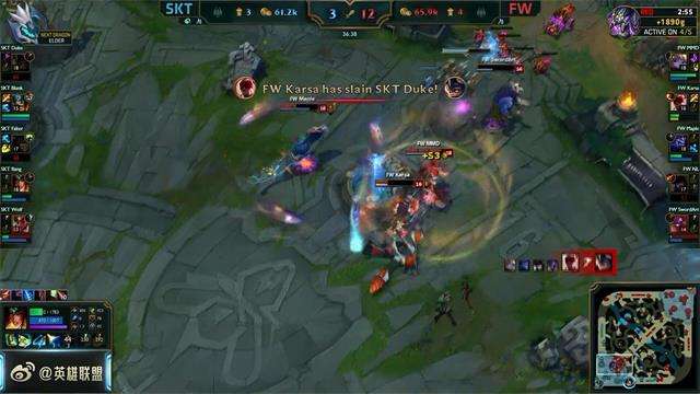 40分钟FW成功拿到了远古龙,并且成功击杀了SKT三人。仅剩两人存活的SKT完全无法阻挡FW的进攻,最终输掉了比赛!果然赢SKT还是要看FW啊...