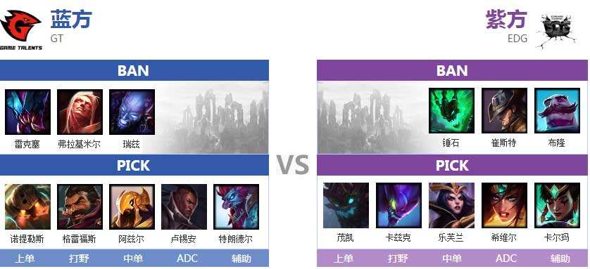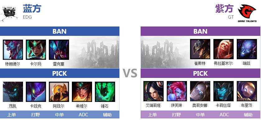 这局比赛BP上就出现了亮点,无双在厂长面前拿出伊芙琳,傻窝也拿出机器人,中路也选择了发条,现场观众也给予GT热烈的掌声。机器人配合无双抢到了厂长第一个红BUFF,随后伊芙琳GANK下路,妹控锤石二级学W直接救下羊驼。两边打野互相入侵野区,随后锤石灯笼带来厂长直接击杀小Q的滑板鞋,EDG继续入侵,傻窝闪现到塔下勾到厂长,交出性命。