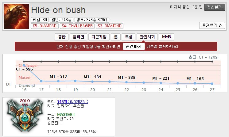 还有一点值得一提的是,Faker的大号即“SKT T1 Faker”直到如今仍未打过一场排位还处于定位赛阶段。而他目前主要使用的账号Hide on bush在前几日虽然被Faker惨遭蹂躏险些跌落钻1,但是近期还是通过一波连胜打到了大师300点避免了掉段的尴尬。