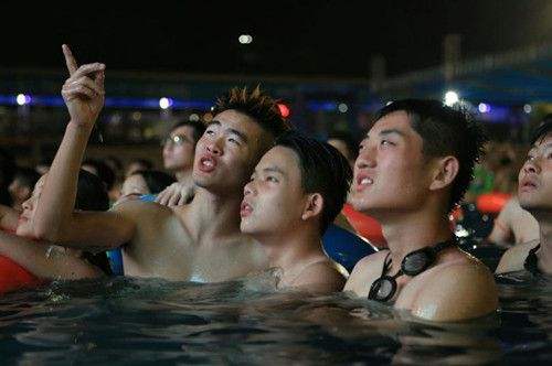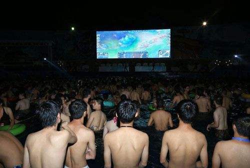 即使到了晚上,玩家人数依然不减,热情的玩家们漂浮在泳池中专注的观看水友赛,感受这别样的观赛体验。