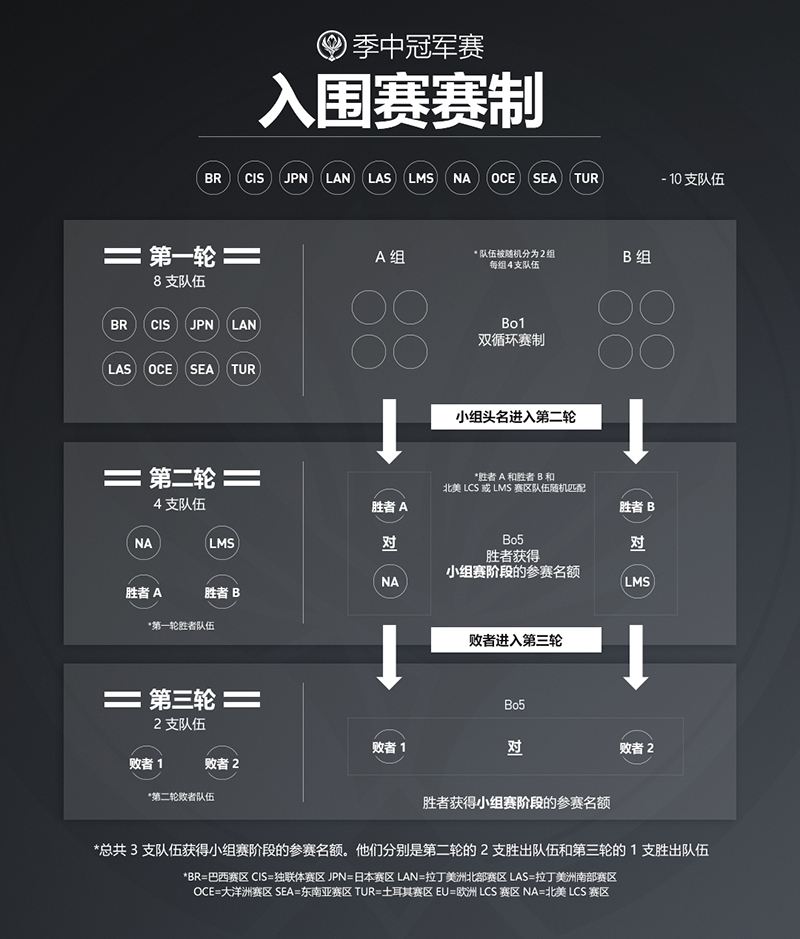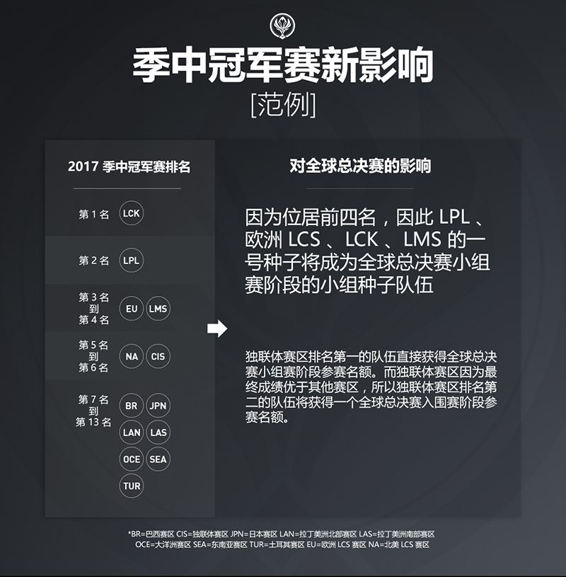 ● 赛区入围名额位置会根据过去两年的季中冠军赛和全球总决赛成绩来决定。