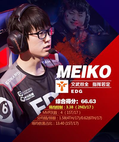 Meiko本赛季作为队内的主指挥,扛起了团队军师的重任,在使用英雄方面,Meiko无论是控制保护类,还是输出类都能使用得淋漓尽致,春季赛Meiko的婕拉有着90%的胜率(十场),场均1W的输出量也让Meiko成为了最想打输出的辅助。