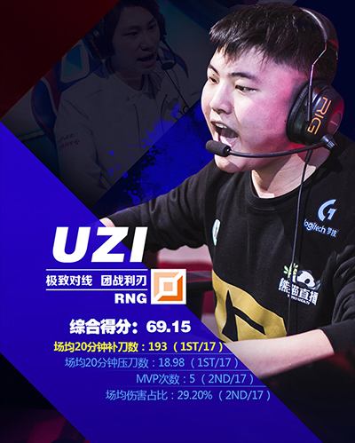 在春季赛中,UZI使用最多的英雄不再是偏重对线的女警、卢锡安,而是更加注重团队的维鲁斯(7次)和艾希(5次),在拥有凶悍对线的情况下,帮助队内开团也成了UZI的职责之一。