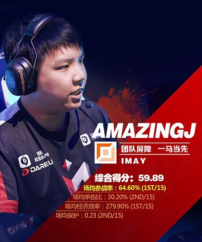 作为IM战队上单的中流砥柱,AJ春季赛使用最多的英雄就是泰坦(9场)、慎(5场)和茂凯(5场)三位功能型英雄,而他也不负众望得成为了 春季赛15位上单中参团率最高的选手,并且排名第二的场均承受伤害更好得诠释了自己团队屏障的作用。