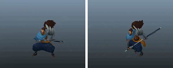 每当亚索进入战斗时就会拔出剑,脱战后不久,他会收剑入鞘。复杂的原因在于亚索既可以在站立时也能在奔跑时入鞘,亦或是在这两种情况之间转换。动画过程中必须完美地对排列一大堆序列,否则他的躯干,胳膊和腿会无法正确排列。